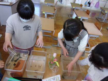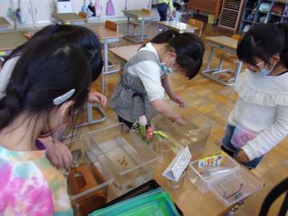 教室では、昨年からお世話しているウーパールーパーのお世話を引き続き行っています。5匹いるうちの2匹はまだ名前がなかったのですが、みんなで相談して無事決定しました。名前の理由がおもしろいので、また次回の更新で発表したいと思います!