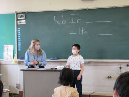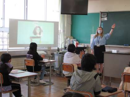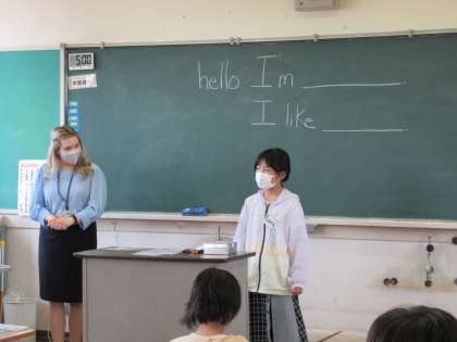 ALTの先生といっしょに、英語で自己紹介をする学習をしました。みんなの前で発表するのは緊張していましたが、上手に発表できていました。今年度もさらに外国語に親しんでいけるとよいですね。