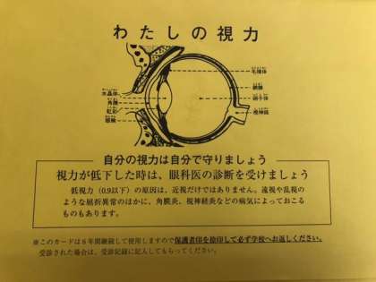 先日実施した視力検査で、視力が1.0以下(B以下)のお子さんに、「わたしの視力」カードを配付しました。眼科への定期受診のタイミングの参考にしていただけたらと思います。