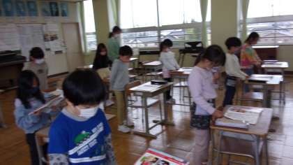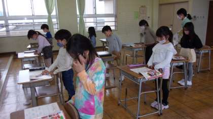 世界のあいさつやありがとうを言葉にして、「メッセージ」という曲を歌いました。呼びかけ合いながら、楽しく歌いました。