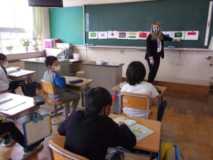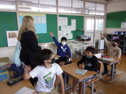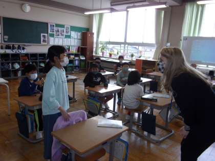 4年生になって初めての外国語の授業。ブリジット先生の自己紹介やクイズに「僕も好き」「犬かわいい」などつぶやき、自分たちからも積極的に質問していました。様々な国の名前や挨拶の言葉をリピートして発音し、握手やハグ等のコミュニケーションにも興味津々でした。これからも外国語の授業が楽しくなりそうです。