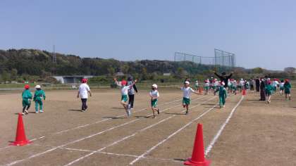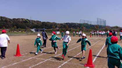 今日の体育タイムは、青空の下、みんなで気持ちよく走りました。体を温め、スタート練習をしていきました。