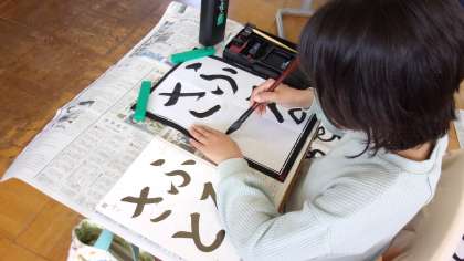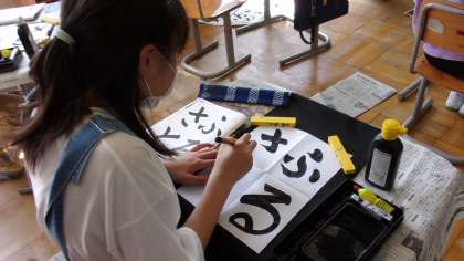 今日の課題は、「ふるさと」という字です。ひらがなの柔らかな運筆に気を付けながら、書きました。