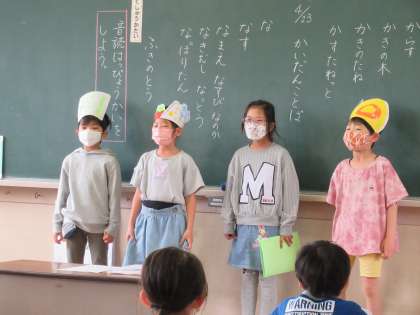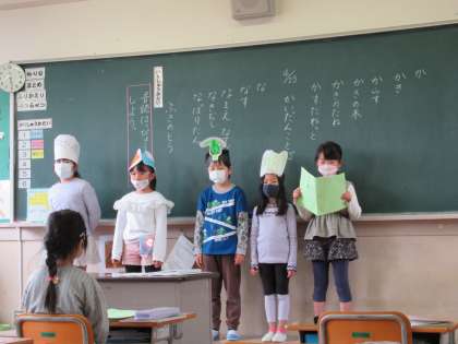 4月23日(土) 2年生 国語の学習「ふきのとう」 公開日 2022/04/23 更新日 2022/04/23 2年生 グループにわかれて、「ふきのとう」という物語を朗読しています。手作りのお面がすてきです。役になりきって、とても上手に発表しています。
