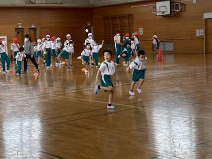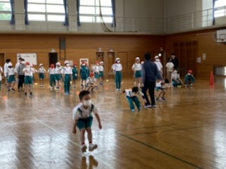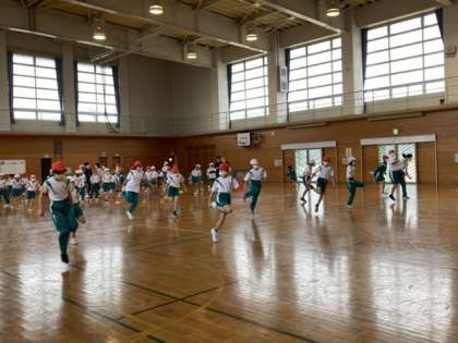 全校体育タイムがありました。今日も、基本の動きを中心に練習しました。一年生も少しずつ上達し、上級生の動きをしっかり見ながら取り組んでいました。