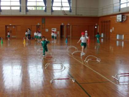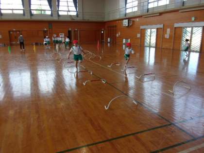 1・2年生 合同体育科の学習 公開日 2022/05/06 更新日 2022/05/06 1年生 ミニハードルを使って、タン、タン、タン、タンと走ります。ハードルの間隔を変えて、ターン、タン、タン、タンなど、リズムよく走る姿がたくさん見られました。