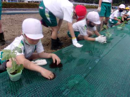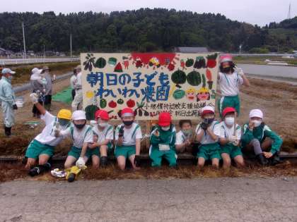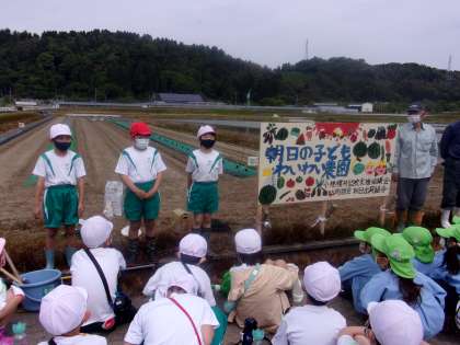 「朝日の子どもわいわい農園 開幕!」今日の学級「ハッピースマイル新聞」のタイトルはこれでした。朝みんながあつまった畑で、「野菜とみんなが笑顔になってほしい」「みんなでわいわい楽しく育てていきたい」と、自分たちの思いを伝えました。スイカとサツマイモの苗植えをわいわい楽しみ、「ここにイチゴとキャベツも植えたい」と終始目を輝かせる子供たちでした。