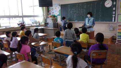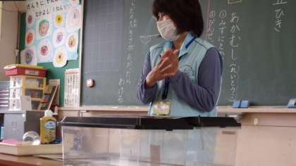 悠久の森事業の一環として、ファミリーパークからオオサンショウウオが届けられました。ファミリーパークの先生に、特徴や育て方を聞きました。これから、1・2年生で大切に育てていきます。