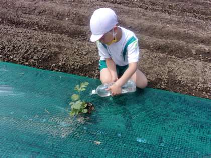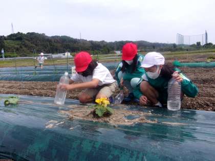 「朝日の子どもわいわい農園」に野菜の顔を見に行きました。「苗がしなっている」「でもあまり水やりしなくてもいいんだよ」「ちょっとだけ水あげようよ」「花が咲いているね」と話し合っていました。野菜に話しかけたり、土の中をのぞき込んで水をやったりしながら、畑を歩き回る元気な子供たちでした。