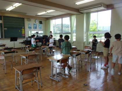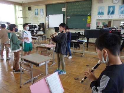 5月17日(火) 4年 音楽の学習 公開日 2022/05/17 更新日 2022/05/17 4年生 みんなで考えた学級ソングの合奏をしています。歌に合う楽器を選び、リズムに合わせてみんな楽しそうに演奏しています。