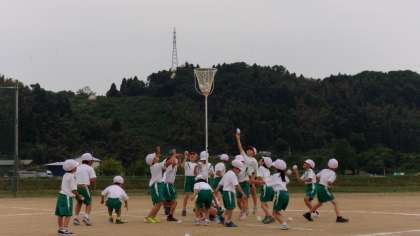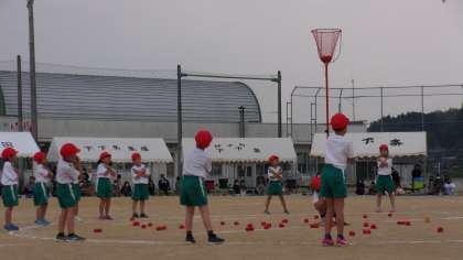 「♪ちぇっちぇっこり」と腰をふり、楽しく踊っていると…「ピーッ」と玉入れの合図がなります。みんな一生懸命投げ入れたので、なんと同点でした。決勝戦までできて、一回戦分多く楽しむことができました。