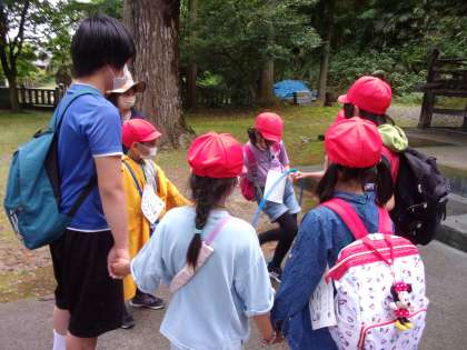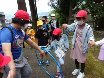 なかよしウォークラリー熊野神社 公開日 2022/05/31 更新日 2022/05/31 学校行事 熊野神社のミッションは、フラフープくぐりです。 フラフープが落ちないように、手が離れてしまわないようにと、グループみんなで協力しました。