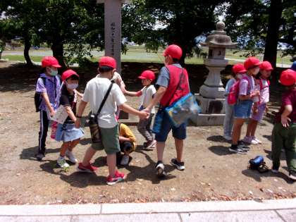 神明社では、わらべうたに挑戦します。 『かごめかごめ』を歌いました。