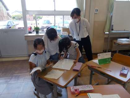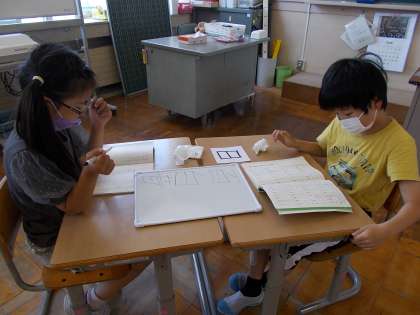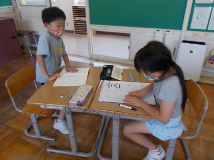 同じ部分をもつ漢字について学習しています。友達と相談しながら熱心に調べています。