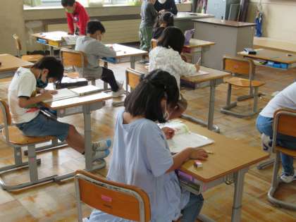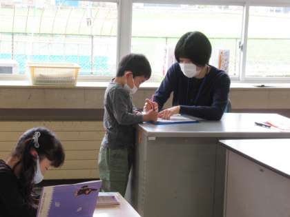 今日は、「「4+3」の式になるお話をつくりましょう」という学習をしました。わからないときは、先生と1対1でていねいに教えてもらいます。日に日にレベルアップしていく1年生です。