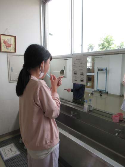 はみがきパワーアップ週間2日目です。今日も鏡を使って、歯ブラシの向きを考えたり、歯ブラシの「かかと」を使ったりして、丁寧にみがいています。