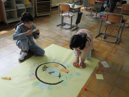 先日実施した「なかよしウォークラリー」で、全校のみんなが見つけた「やる気の花」と「やさしさの花」の掲示物を作成しています。運動会に引き続き、学校のために働きかける6年生です。