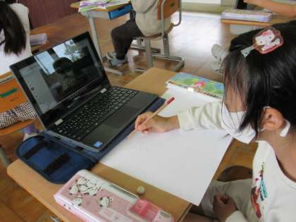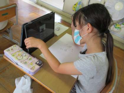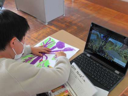 6月8日(水)2年生 野菜の観察 公開日 2022/06/08 更新日 2022/06/08 2年生 自分が育てている野菜のスケッチをしています。クロムブックを使って写真をとり、その写真を見て絵を描きます。「あと少しで実が赤くなるんだ」「もう収穫できたよ」「まだまだ小さいから、これからおおきくなるんだよ」どうやら、一人一人育てている野菜がちがうので、成長のスピードもちがうようです。