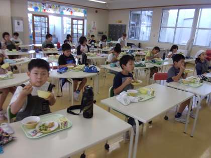 給食の準備を張り切って行う子供たち。久しぶりに全員がそろったことと、唐揚げメニューが嬉しくて、いつも以上に笑顔でいただいた、楽しい美味しい給食でした。