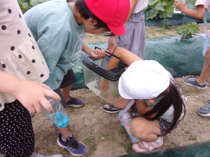 現在、学校農園でそれぞれの野菜を育てている2年生の子どもたち。主にきゅうりを中心に、アブラムシがやってきて野菜の生長を邪魔して困っていました。そこで、生活科の授業で解決策を考え、まずは農薬などを使わず、アブラムシが好物のテントウムシを放してみようということになりました。
