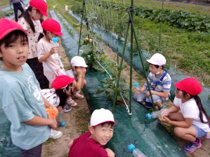 そして今日、子どもたちが通学路や家の近くで探してきたテントウムシを、きゅうりの葉に乗せてみる実験を行ないました。「アブラムシ食べてくれるかな?」「また月曜日に見に来なくちゃ」と期待を膨らませていました。