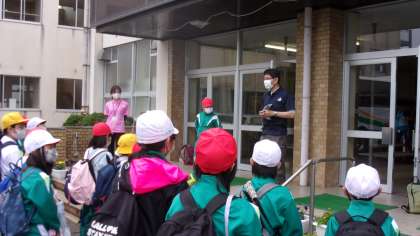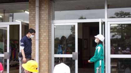 正面玄関で、出発式をしました。みんなで協力して活動を楽しんできてほしいと思います。学校に残る学年のみんなも窓から「いってらっしゃあい」と見送りました。