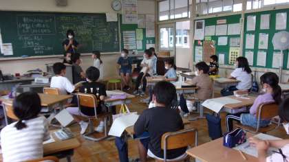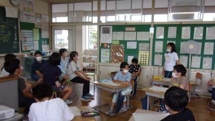 スイカの世話について3年生が質問し、6年生が答える時間を設けました。「卵くらいの大きさになったら、日づけを書いたテープを付けて…」などと、収穫までの目安を6年生がレクチャーしました。