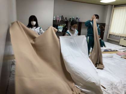 自分の部屋に戻って、布団の準備をしました。シーツの敷き方、大丈夫かな??しおりを確認して、友達と協力して、がんばっています。
