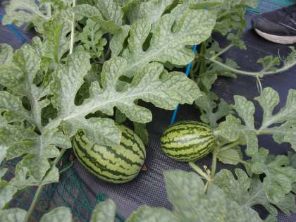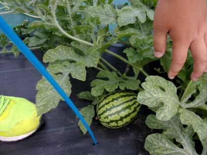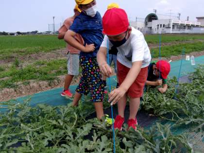 畑のスイカがみるみる成長し、太く大きな茎や葉の間から小玉スイカが顔を出しました。葉をかき分けながら、「スイカできてる!」「ここにも二つ」と次々と発見し、歓声をあげました。棒に「6月20日」と印を付け、「毎日顔を見に行かなきゃ」とこれからの実の成長をますます楽しみにしています。