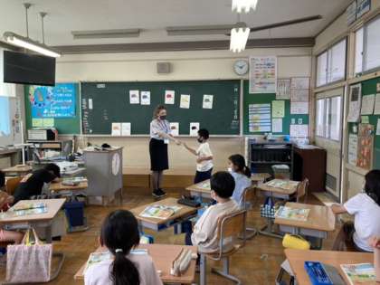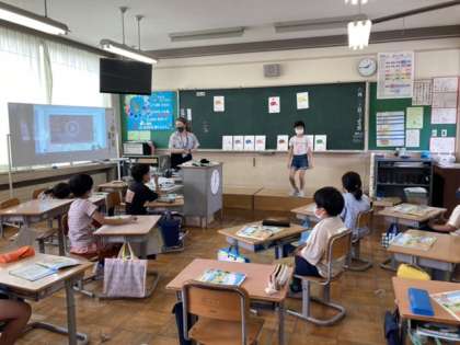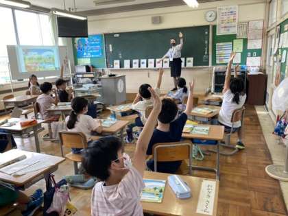 6月21日(火) 3年生 外国語活動の時間 公開日 2022/06/21 更新日 2022/06/21 3年生 色を英語で言う学習をしました。様々な国の子供たちが、自分の好きな色で虹を描いているのを見て、色の選び方にも、国によって違いがあることに気づくことができました。みんな、進んで発表し、英語での言い方に慣れ親しみました。