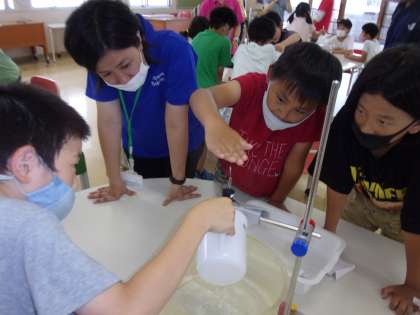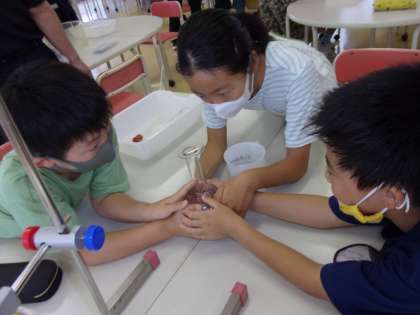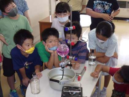 噴水遊びを通して、空気や水の性質について楽しく学びました。フラスコをみんなの手で温め、湯で温め、シャボン液が膨らむ様子から、「温まった空気が上に上がるんだ」「空気が大きくなったんだよ」とつぶやく子供。水と比較すると、空気の方が膨らみが大きいことから、フラスコ内の水を減らした方が、より水が上がり、噴水が高くまで跳ぶと気付きました。「僕達、ここまで噴水きたよ」と高さを手で示し、興奮しました。「空気や水の性質が使われている物は他に何があるんだろう」と学習意欲を高めました。