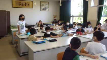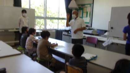 地域のスイカ名人に来ていただき、育てているスイカについての学習をしました。「どのくらいの大きさになったら収穫できるか」「朝日スイカには、どんな品種があるのか」など、たくさんの質問に答えていただきました。甘いスイカを食べる日が楽しみです。