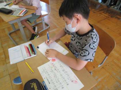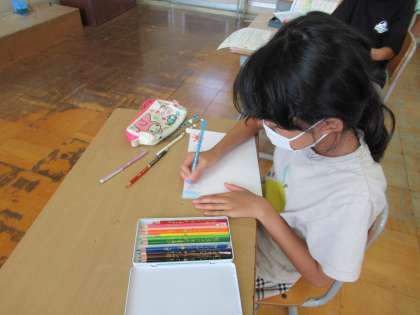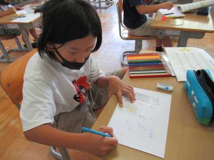 練習している歌のメロディーや歌詞から連想するものを、イラストにして表現しています。青空を描いたり、お日様を描いたり、寝そべっている自分を描いたり・・・。歌うときのイメージがとても豊かになりますね。