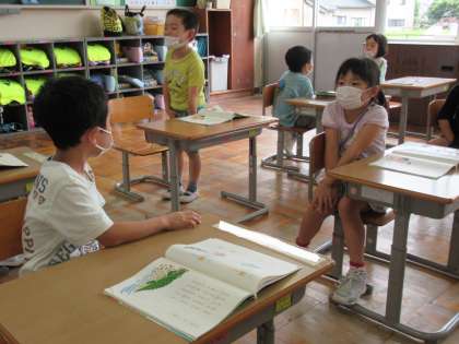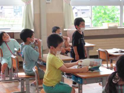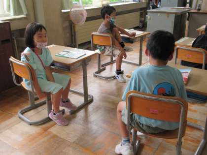 国語の学習で、自分のすきなものについてお話をしています。隣の人とペアになって、自分のことを話したり、相手のことを聞く学習です。「わたしはスイカがすき」「ぼくはアジフライがすき」楽しい会話が聞こえてきます。