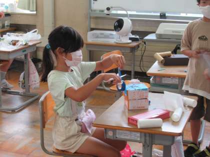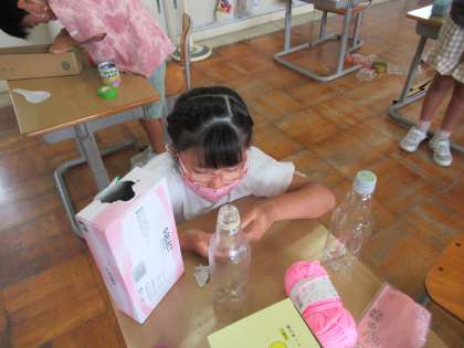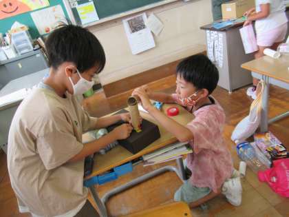7月5日(火)2年生 図画工作の学習 公開日 2022/07/05 更新日 2022/07/05 2年生 家から持ってきた材料を使って、「音の出る」おもちゃを作成しています。たたいて音を出したり、振って音を出したり、ゴムをはじいて音を出したり・・・アイディアいっぱいの2年生です。