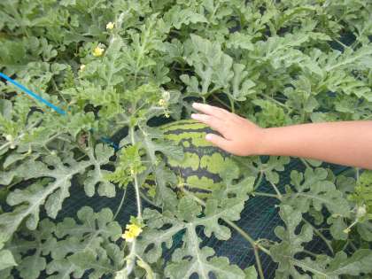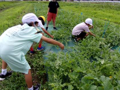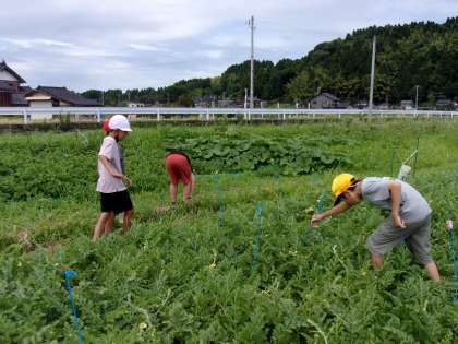 わいわい農園で、連日スイカが実をつけています。「ここにもスイカ」「小玉がたくさん」と次々と発見し、今日は19本の着果棒をさしてきました。大きなスイカを手でたたいて「中身がつまってる音がする」と言う子供もいました。着果棒をさしてから40日から45日後に収穫することを先日金田さんに教わったので、日数を数え、収穫の日を計算し始めました。