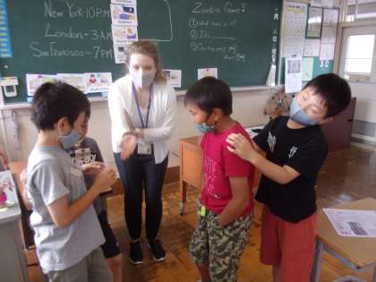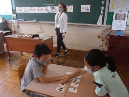 「何時かな?」の歌やゲームを楽しみながら、英語に親しんでいます。今日は、ブリジット先生の発音をリピートしたり、友達とやりとりしたりしながら、カルタやゾンビじゃんけんに夢中になりました。数か国の動画を見聞きし、「AM7時はブレックファーストタイム」「PM5時はホームワークタイム」など、時計の針をテキストに書き込んで確認していきました。