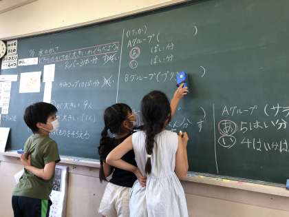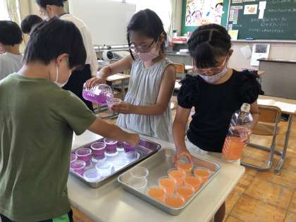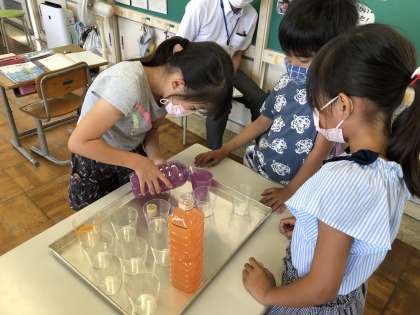 7月8日(金)2年生 算数 水のかさをくらべよう 公開日 2022/07/08 更新日 2022/07/08 2年生 違う容器に入った2本のジュース。どちらの「かさ」 が大きいのかを、比べました。まずは同じ容器にジュースを注ぎ直して比べます。プリンのカップ、平たいカップなど、それぞれに慎重に注ぎます。どっちが大きいかな?