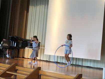 2年生はピアノ伴奏をBGMに、フラフープ、跳び箱、フリスビー、鉄棒を披露しました。