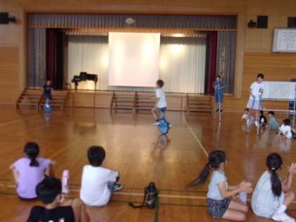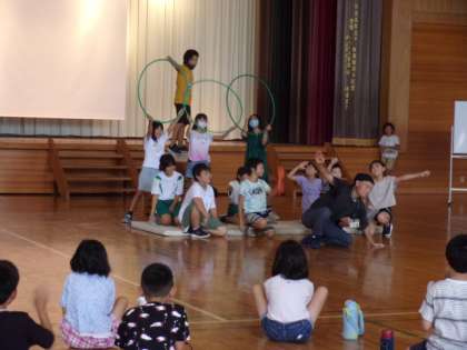 7月8日(金)にこにこわくわく七夕集会その4 公開日 2022/07/08 更新日 2022/07/08 学校行事 5年生は跳び箱やフラフープ、マット運動を音楽に合わせて披露しました。担任の先生のアクロバットにみんなびっくり。全員の決めポーズもばっちりでしたね。 6年生は、鉄棒や竹馬、一輪車を披露しました。難易度の高い鉄棒の技に、1年生が驚きの声をあげていました。さすが6年生、かっこいいですね。