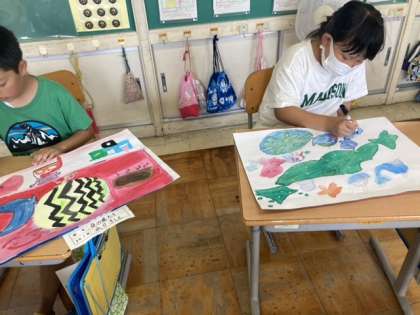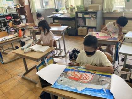 図工では、「ひらいて広がるふしぎな世界」を学習しています。宇宙人の世界や花畑の世界など、思い思いの世界を楽しんで描いています。完成が楽しみです。