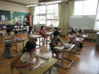 「1dL(デシリットル)」という新たな単位を学習した2年生。今日は1dLますを使って、かさを測りました。慎重にジュースを注ぎ、測った結果をしっかりとノートに書き留めました。