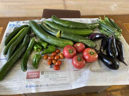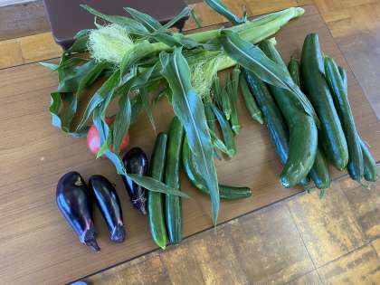 7月14日(木)大収穫祭! 公開日 2022/07/14 更新日 2022/07/14 2年生 2年生が学校農園で育てている野菜ですが、天気にも恵まれ収穫がどんどん進んでいます。あまりの成長の早さに、取り遅れてしまったものもありますが、子供たちはスーパーであまり見かけない野菜の姿に興味津々でした。トウモロコシも、大きな実がなる前のヤングコーンをまずは食べてみるようです。たくさん採れた野菜はみんなで交換し合い、いろんな野菜を味わいます。