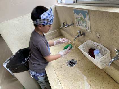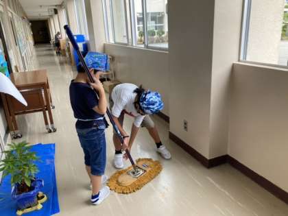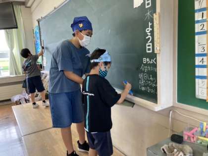 掃除もしっかり取り組む朝日っ子。一年生も、黙々と取り組む姿に成長を感じました。よく見ると、「隙間のごみはこうやって取るんだよ」などと熱心に掃除の仕方を教える上級生たちの姿がありました。誰に言われなくても、さりげなく教えたり、学んだりする姿を見て嬉しくなりました。