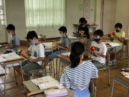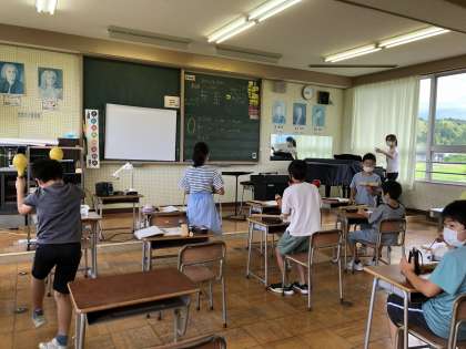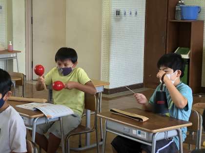 マラカスにカウベル、ギロ等、いろんな楽器を使って楽しく合奏しています。曲を聴いて、音を鳴らして、曲のイメージを膨らませます。「砂漠」のイメージ?「熱血」なイメージ?歌って、楽器を奏でて、とても楽しい音楽の時間です。