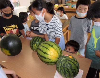 7月15日(金)3、4年生 スイカの見比べ