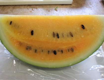 総合的な学習の時間に、地域の方が持ってきてくださったスイカを4種類並べ、よく見て、違いを想像しました。「紅まくら」「かがやき」「ピノ・ダデイ」「サマーオレンジ」です。外見の印象と割ったときの印象、においや色やみずみずしさなど、自分たちなりの観点で見比べていました。糖度計で糖度を測定した子供の「これ15、5度もある」という声に、みんなで驚きました。