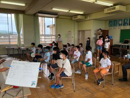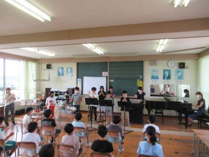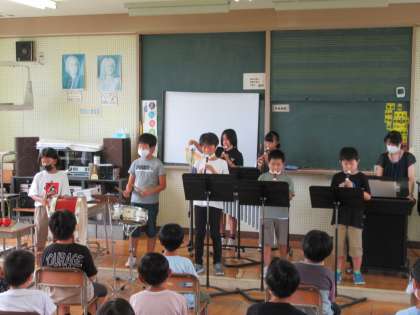 7月20日(水)音楽クラブ ゲリラ虹ライブ! 公開日 2022/07/20 更新日 2022/07/20 学校運営協議会 お昼休みに、音楽クラブが「虹」という曲を2曲披露するゲリラライブを開催しました。1学期のクラブ活動で一生懸命練習してきた曲です。リコーダーや鉄琴、パーカッションにピアノなど、それぞれ担当楽器を演奏しました。 音楽室に集まって聞いてくれたみんなは「アンコール!」と大盛り上がり。また練習して、みんなに楽しんでもらう機会があるといいですね。