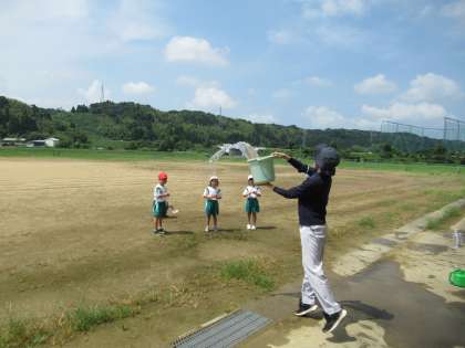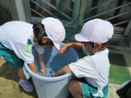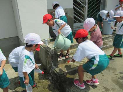 7月20日(水)1年生 たのしいみずあそび 公開日 2022/07/20 更新日 2022/07/20 1年生 ペットボトルなどの容器を使って、水遊びをしました。暑い日にぴったりですね。溝には、はさみ虫を発見したようです。生き物や植物にもやさしく接しましょうね。 暑い日でも元気いっぱいな1年生でした。