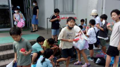 7月25日(月) 夏休みも元気! 公開日 2022/07/26 更新日 2022/07/26 朝日小学校NEWS 夏休みに入りました。午前中の図書室開放、午後のプール開放にあわせて、たくさんの子供たちがやってきました。 プール開放では、思い思いの泳ぎや遊びを楽しんでいました。 プールを楽しんだ後には、調理員さんが切ってくださったわいわい農園のスイカを食べました。みんな「甘い!」と喜んで食べていました。